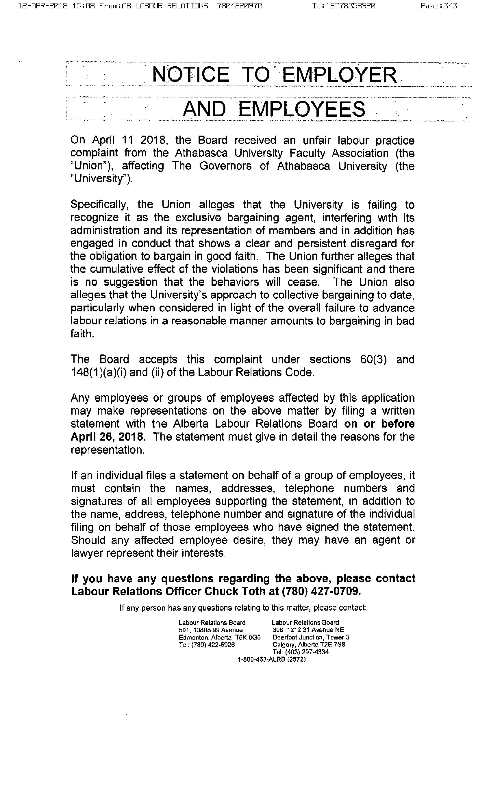 The Notice of Unfair Labour Practice is below, which we have posted here as AU has failed to post it in a timely manner as they were directed to do by the Labour Board. Even though AUFA has sent out this notice in order to inform its members, the employer is still obligated to inform its staff by posting the notice for all employees to see. If you are aware of this notice having been posted by the employer, please let the AUFA office know the location of the posting.